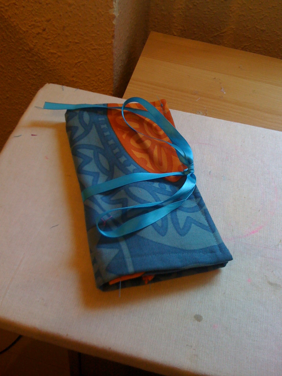 Y así es como queda abierto , con varias zonas para guardar todas las joyas, , un bolsillito con una cremallera para poder meter todo lo que se nos puede caer , tipo pulseras o pendientes pequeñitos, un cilindro de fieltro (color naranja) para poder meter los anillos que llevemos, todos bien organizaditos, y varios recortes de fieltro para poder pinchar los pendientes, tanto de rosca como de ganchito.